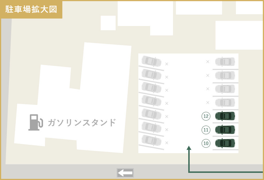 駐車場は建物より北へ190m(徒歩3分ほど)にある駐車場内、10・11・12番をご利用ください