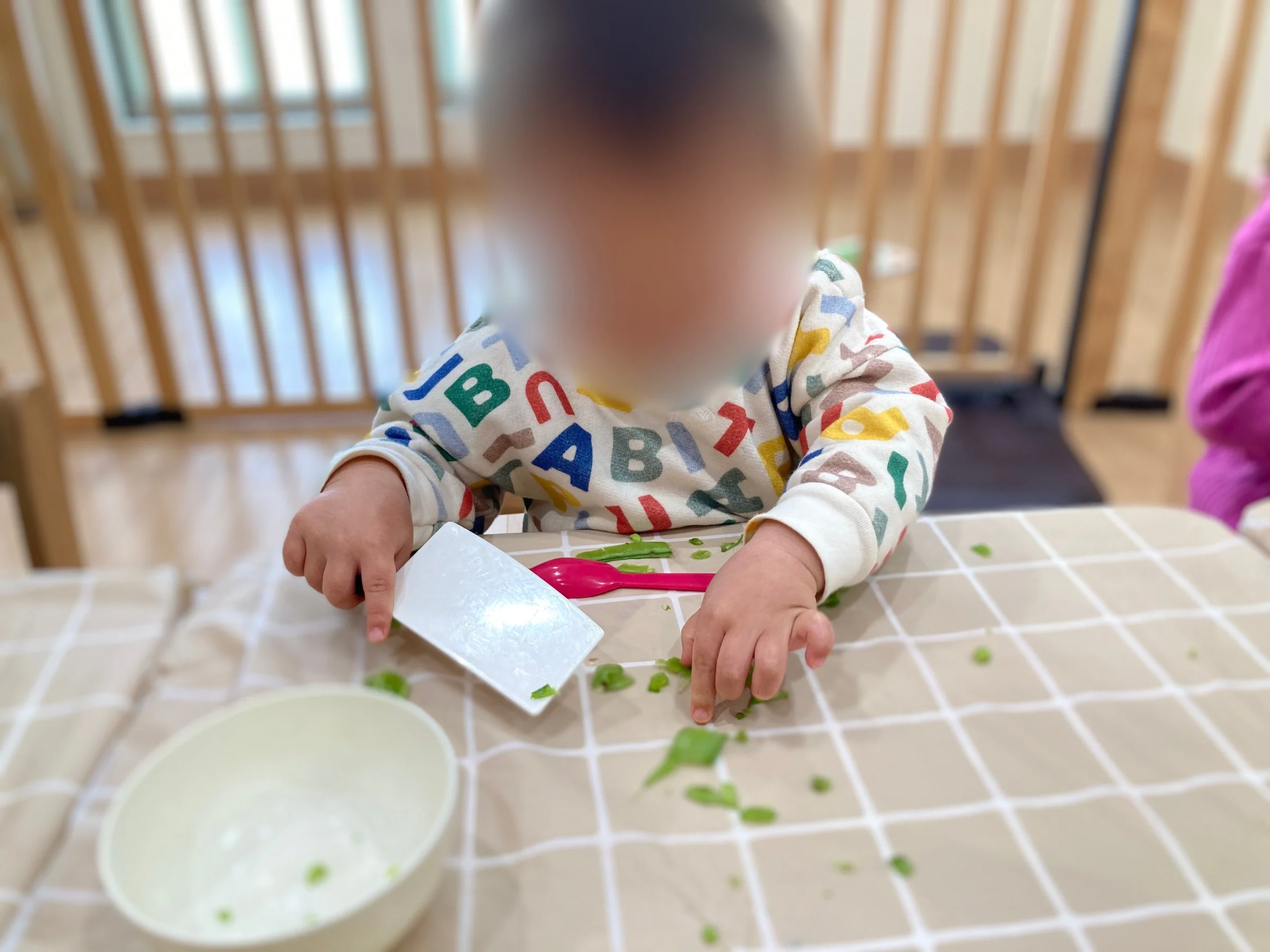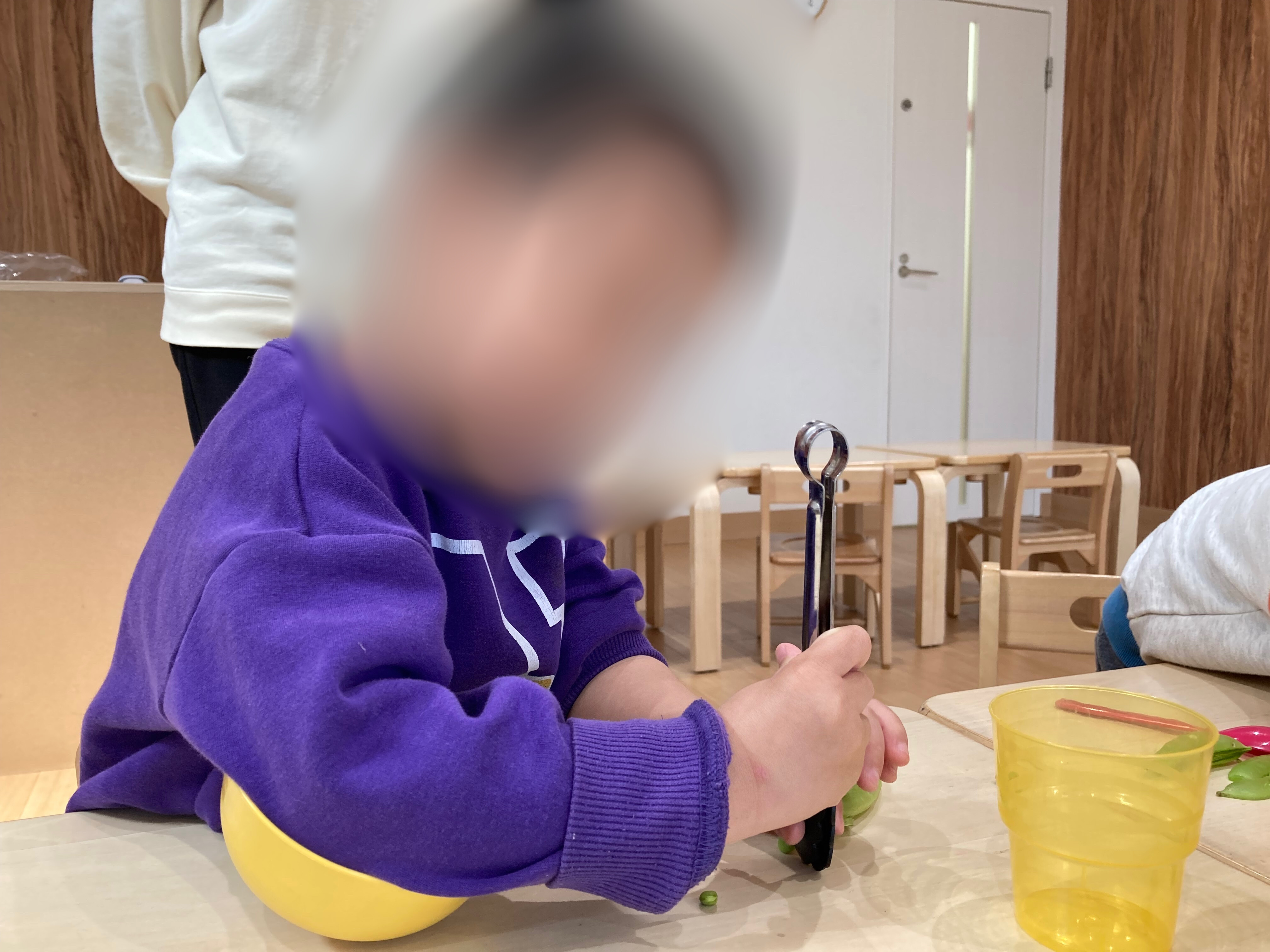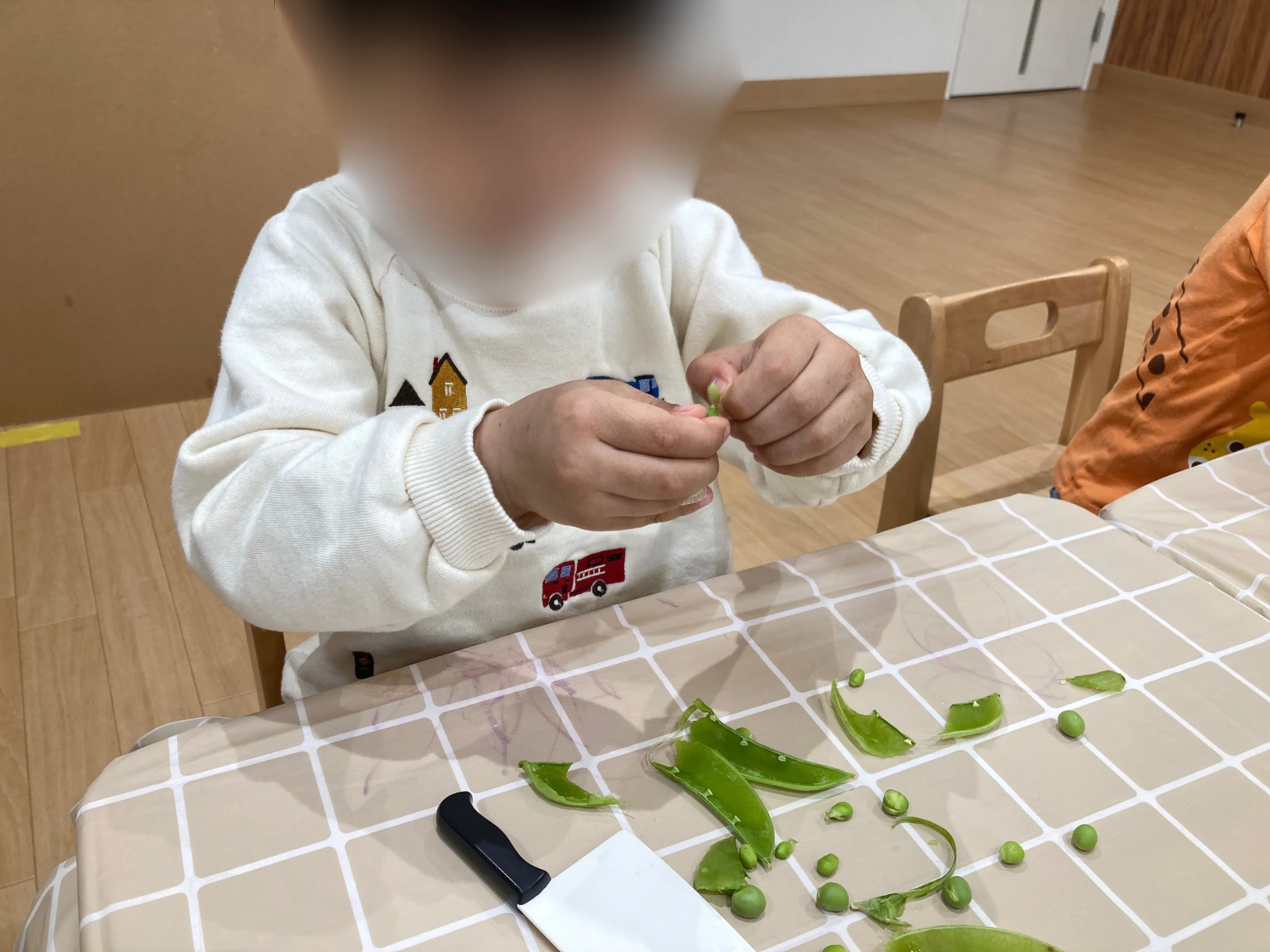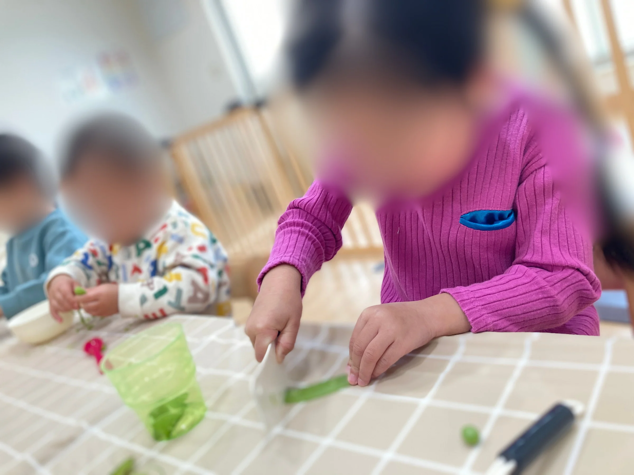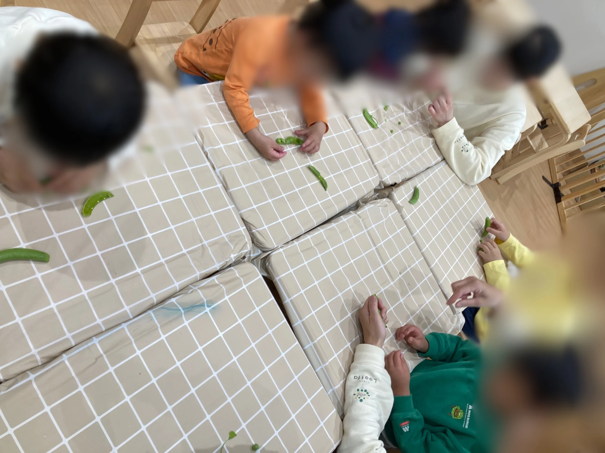 今回は季節の野菜を知り、触れてほしいという思いから、スナップエンドウで感触遊びを行いました。