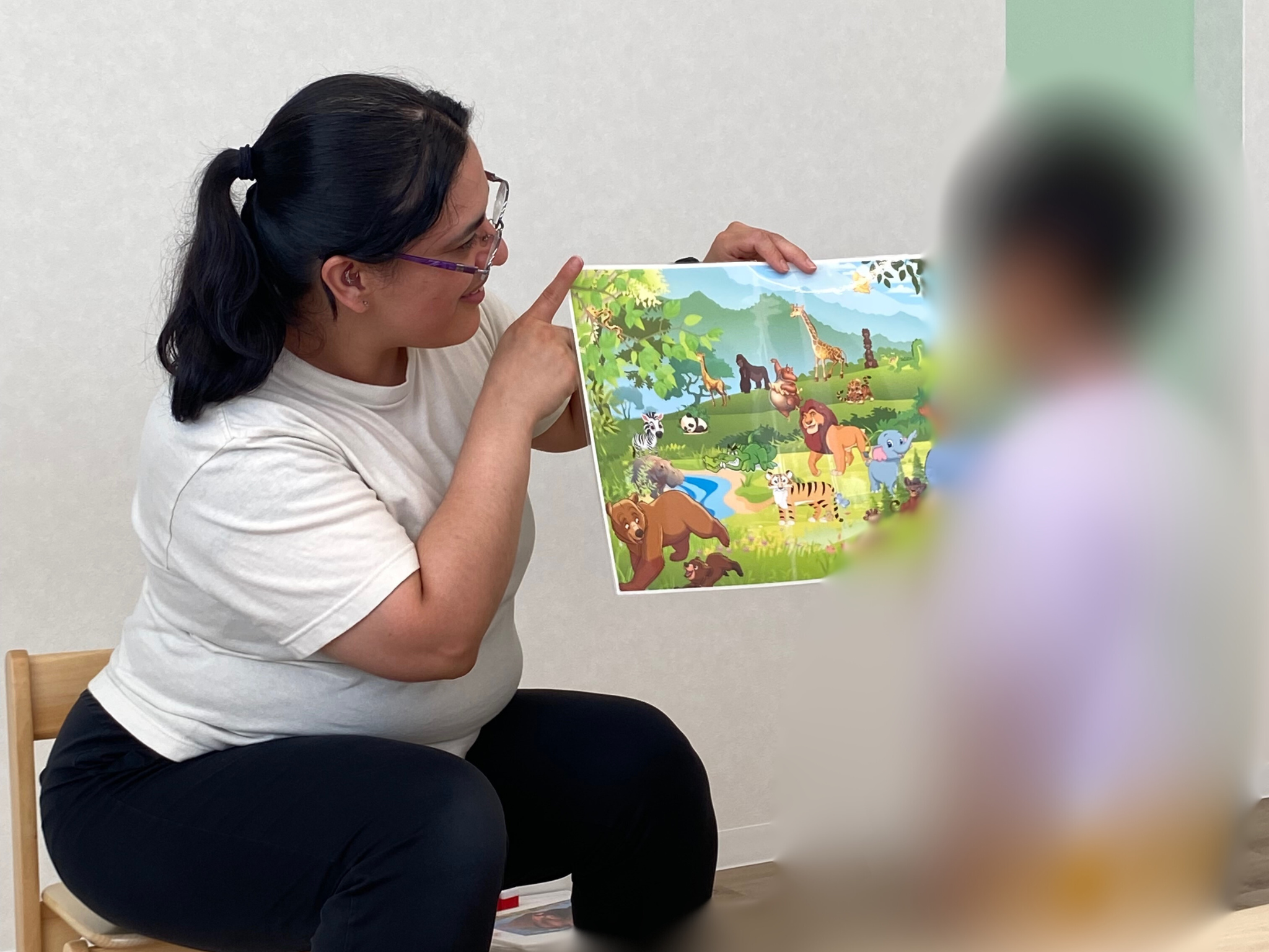 講師の発音にじっくり耳を傾けて、真剣に楽しく動物を探す子どもたちです。