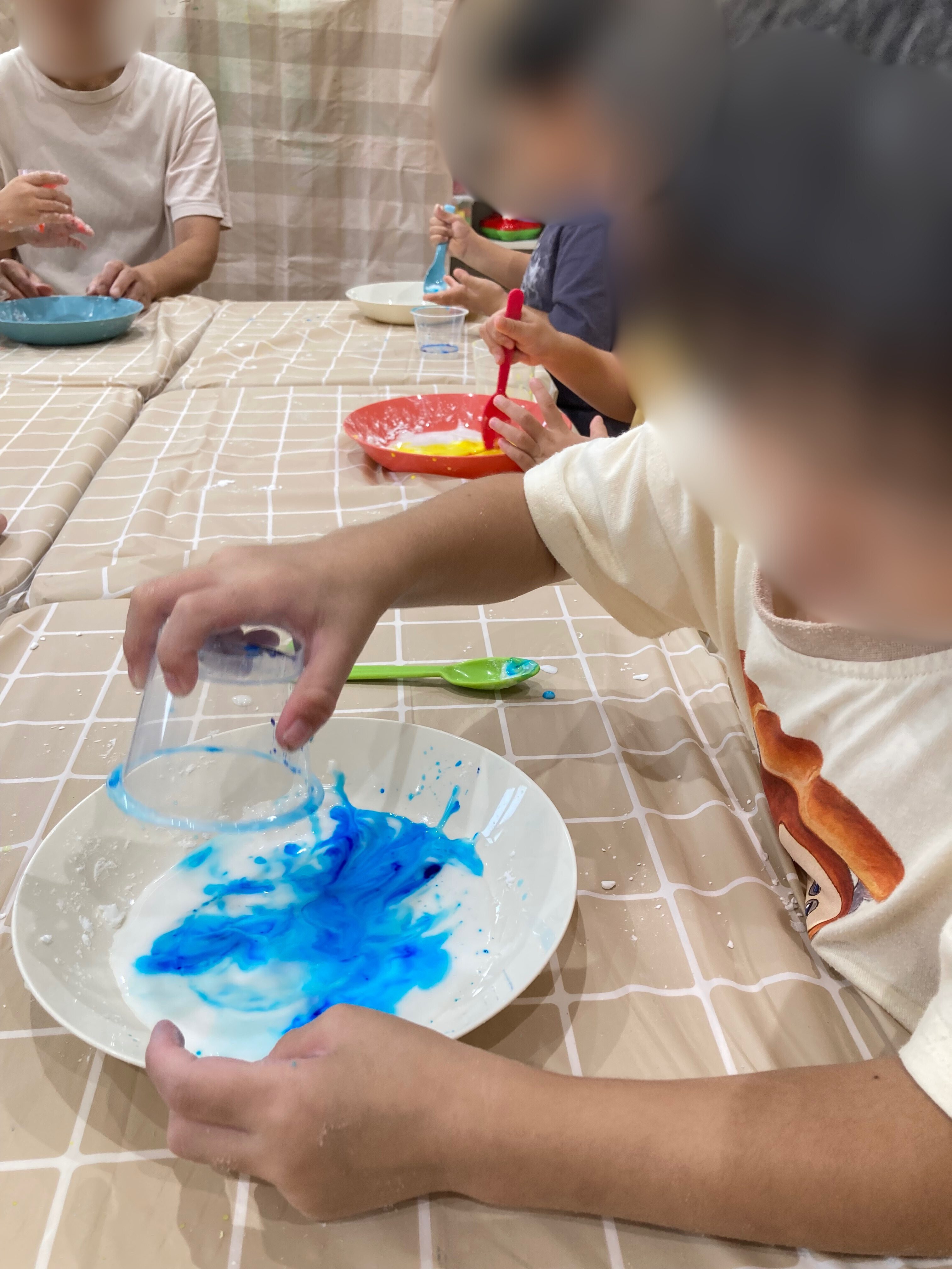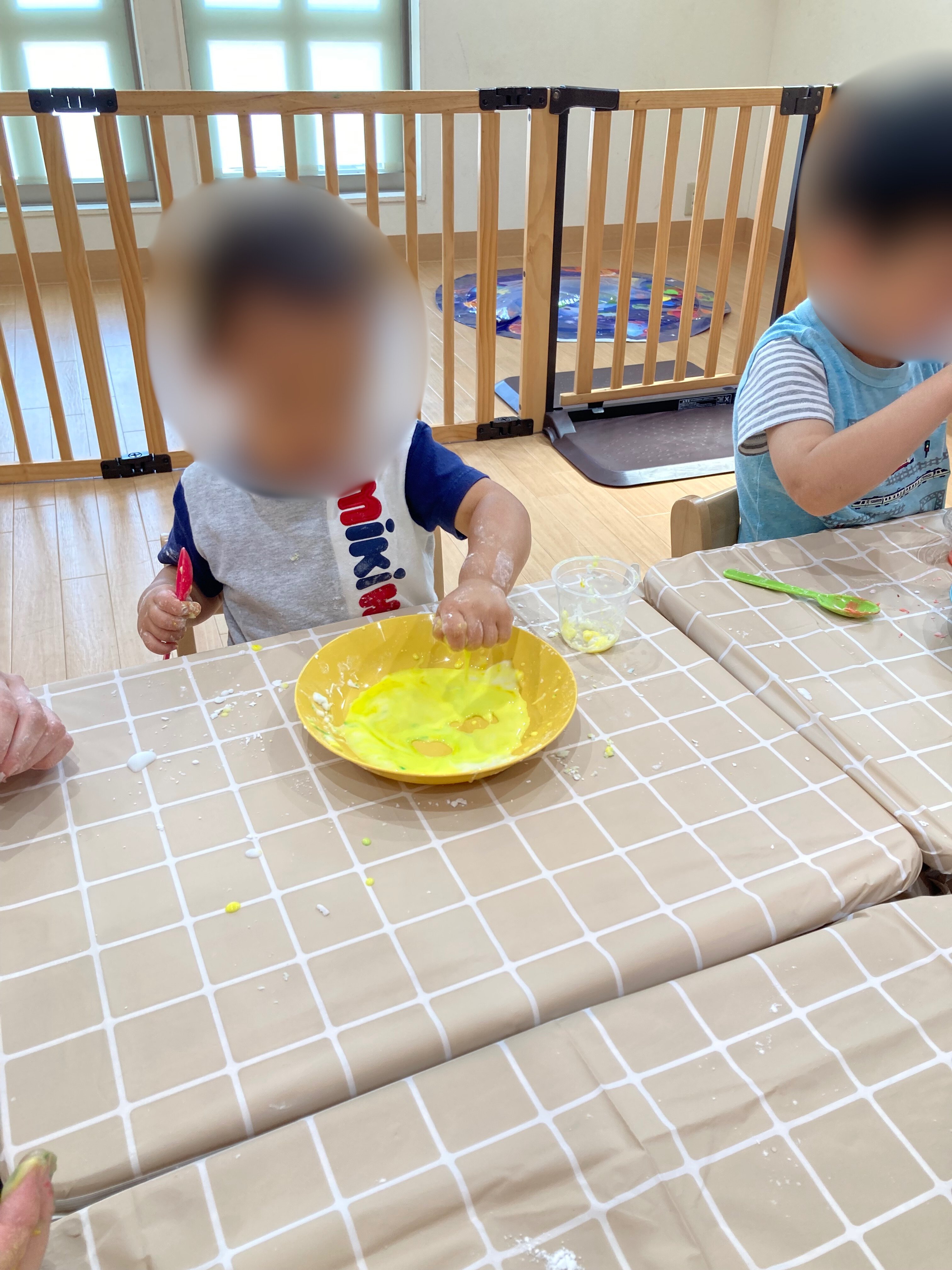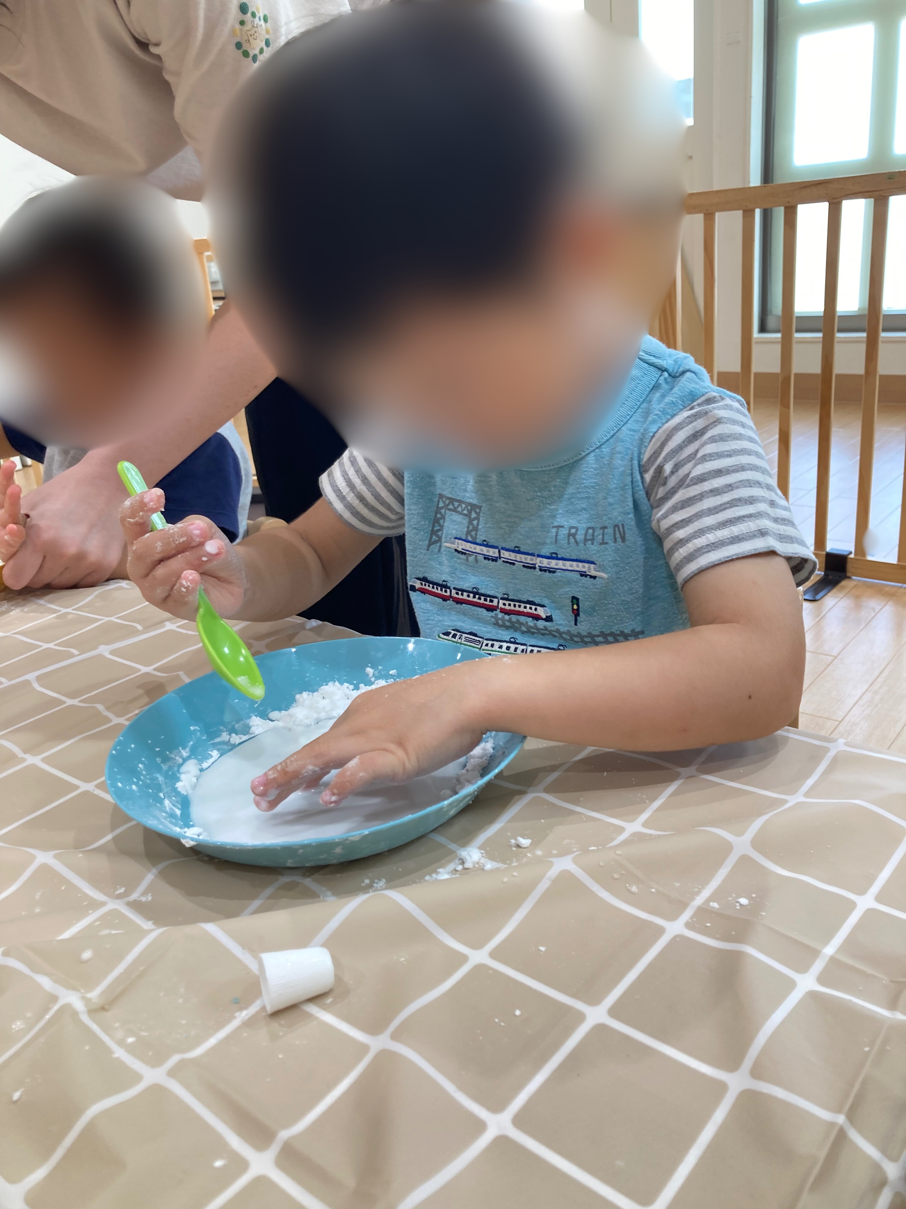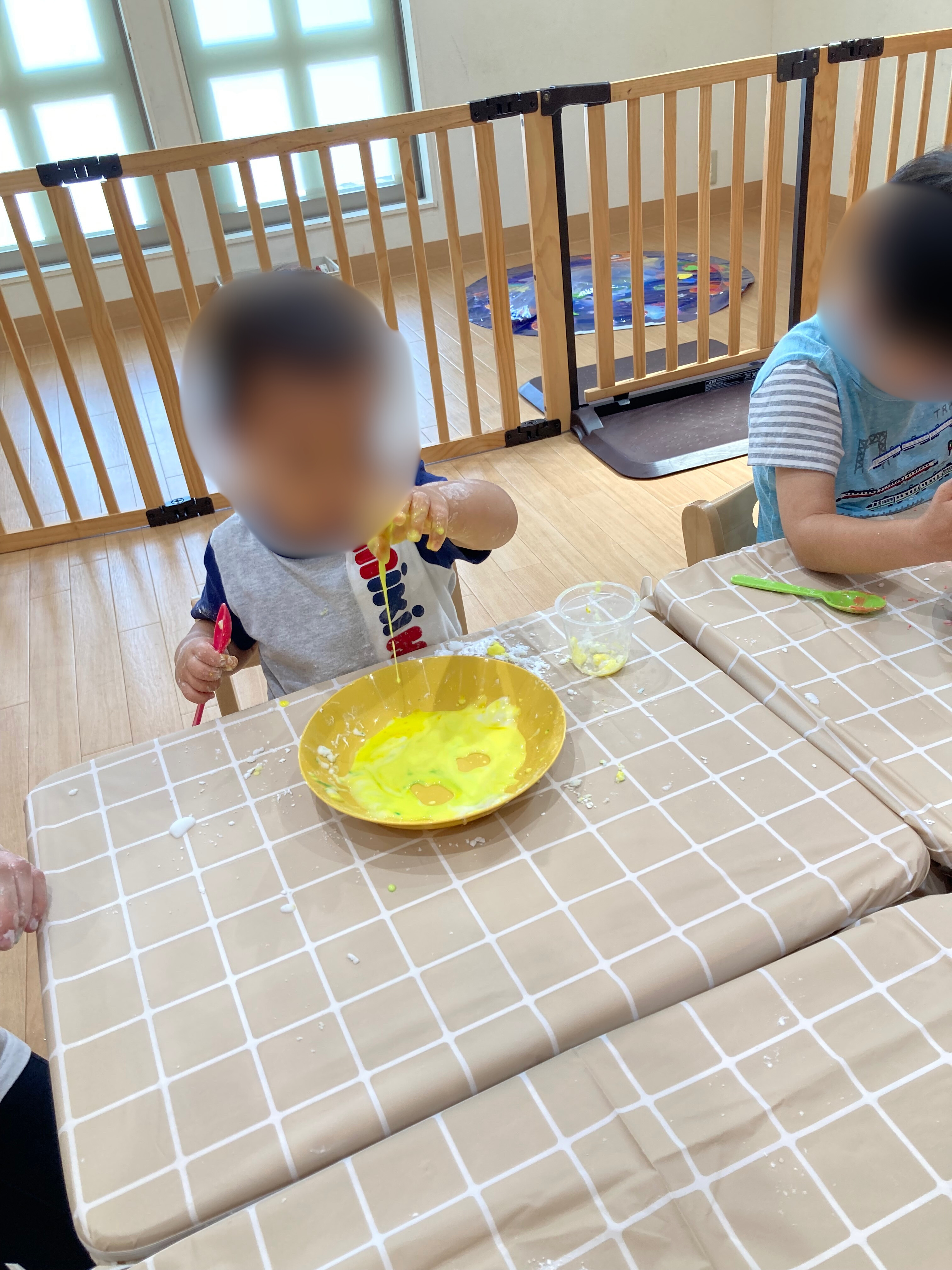 スプーンで混ぜて楽しむ子や手で感触を楽しみながら混ぜる子など
