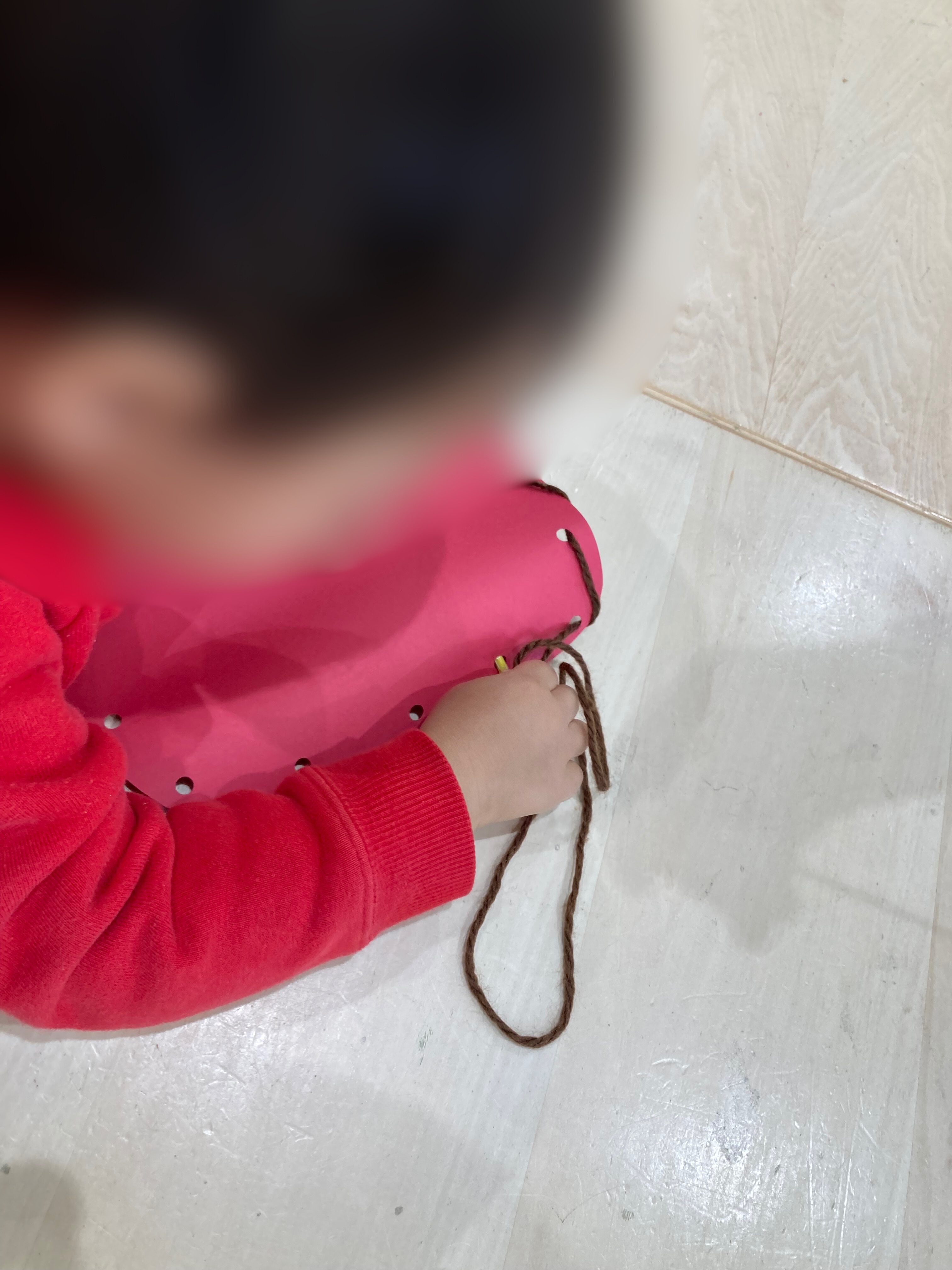 穴の開いたブーツ型の画面紙に毛糸をジグザクと通していきます🧶