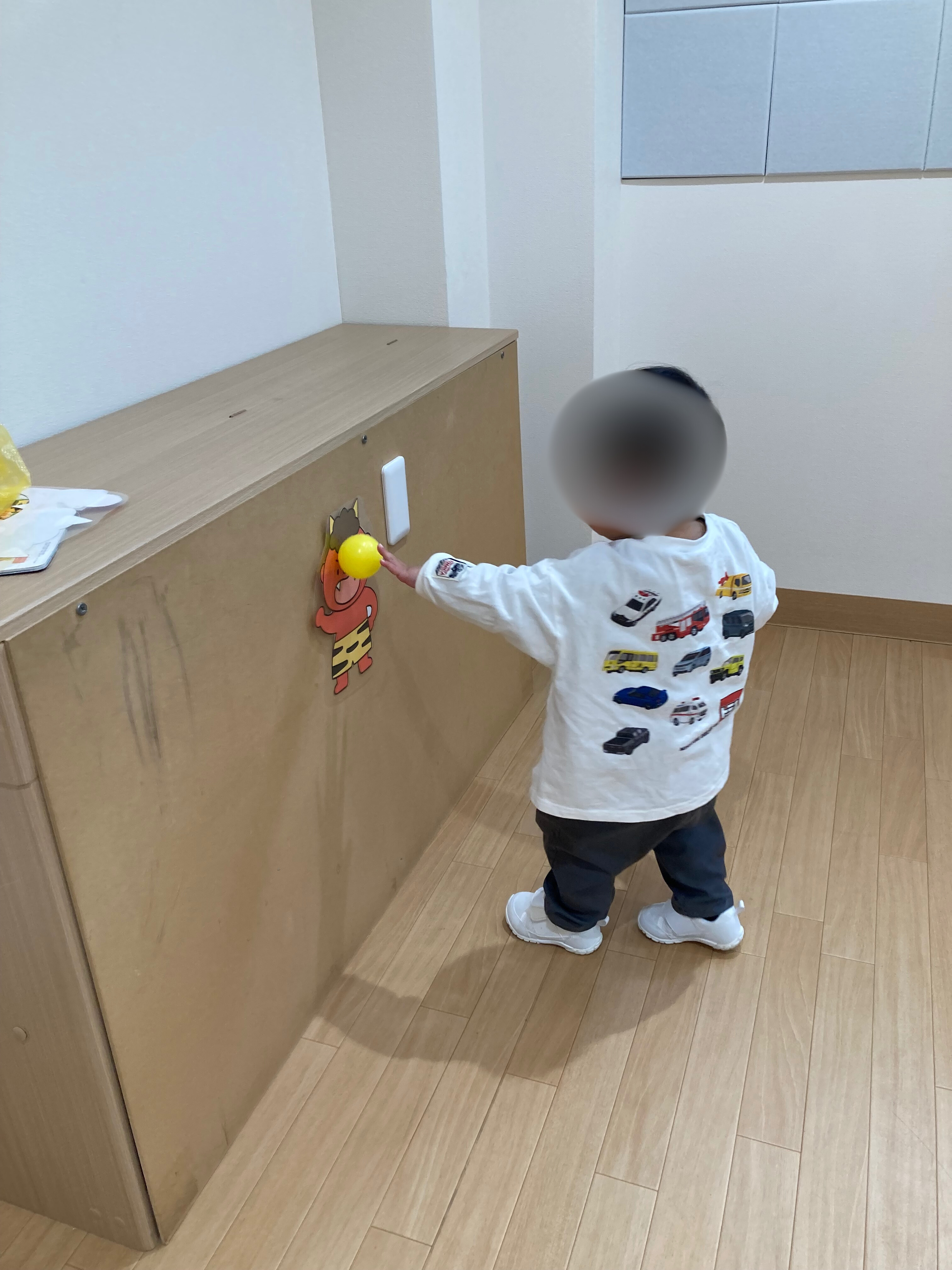 部屋の様々な場所に貼られた鬼をしっかり探し、狙って投げたり当てています!