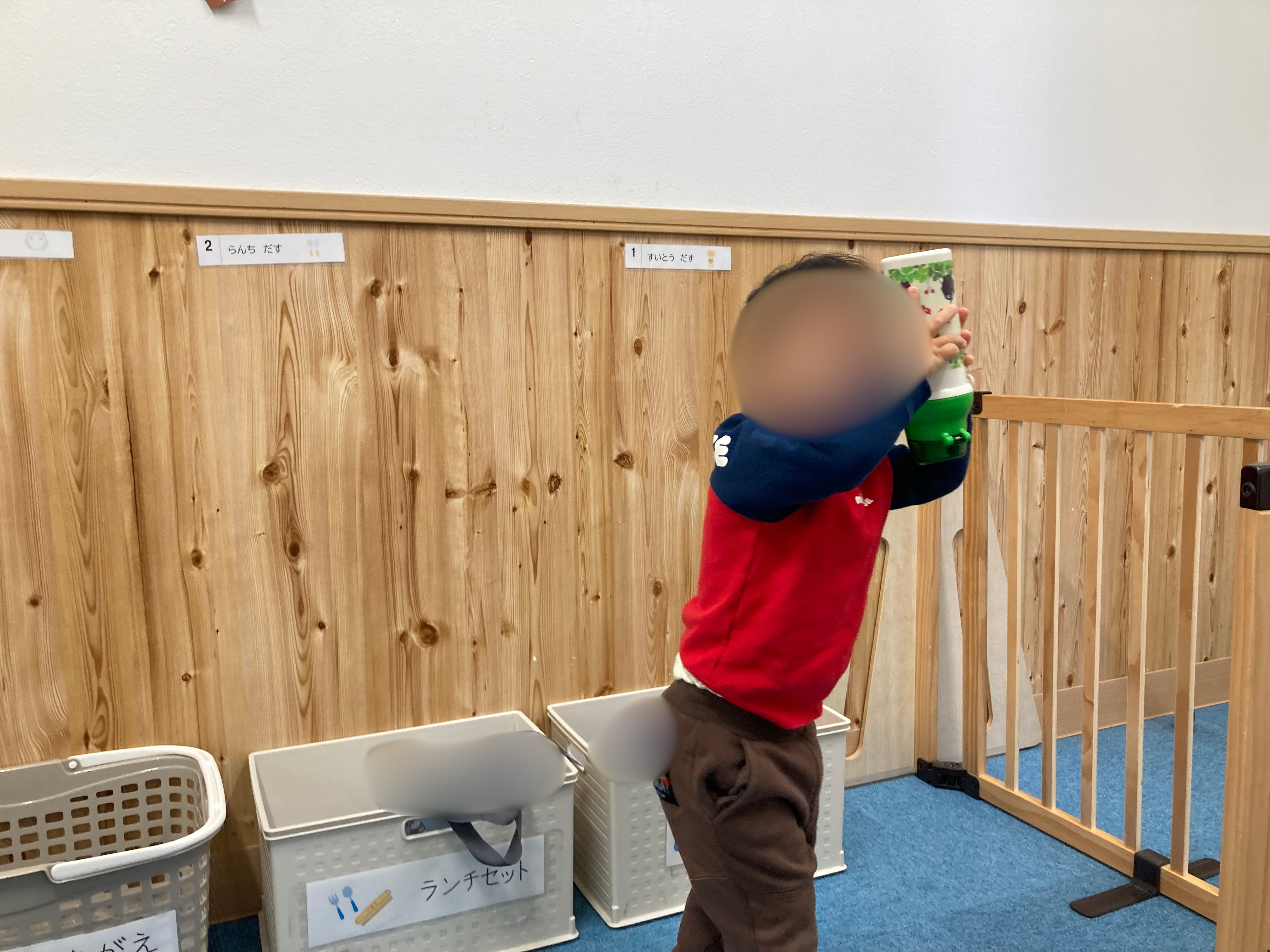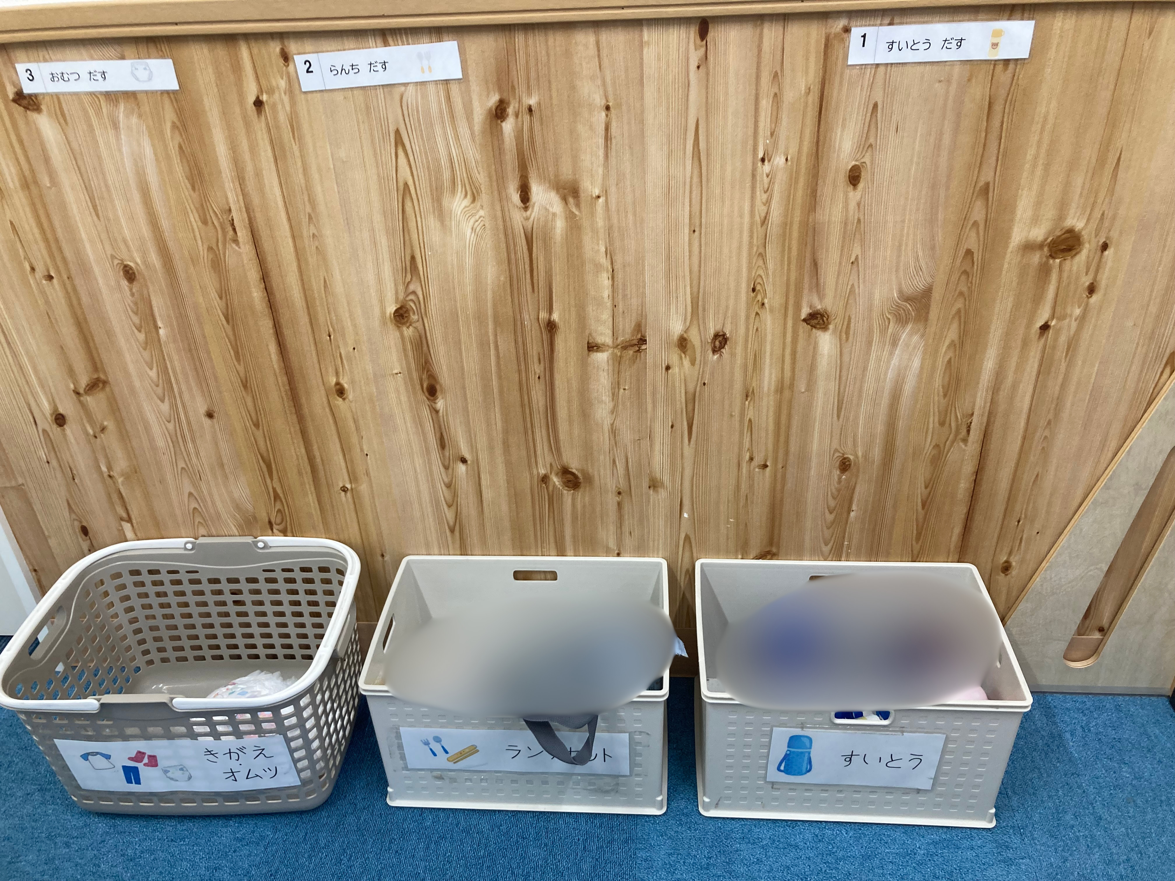 靴をしまった後は、〈水筒・ランチ・オムツ・タオル〉を所定の場所に準備します。