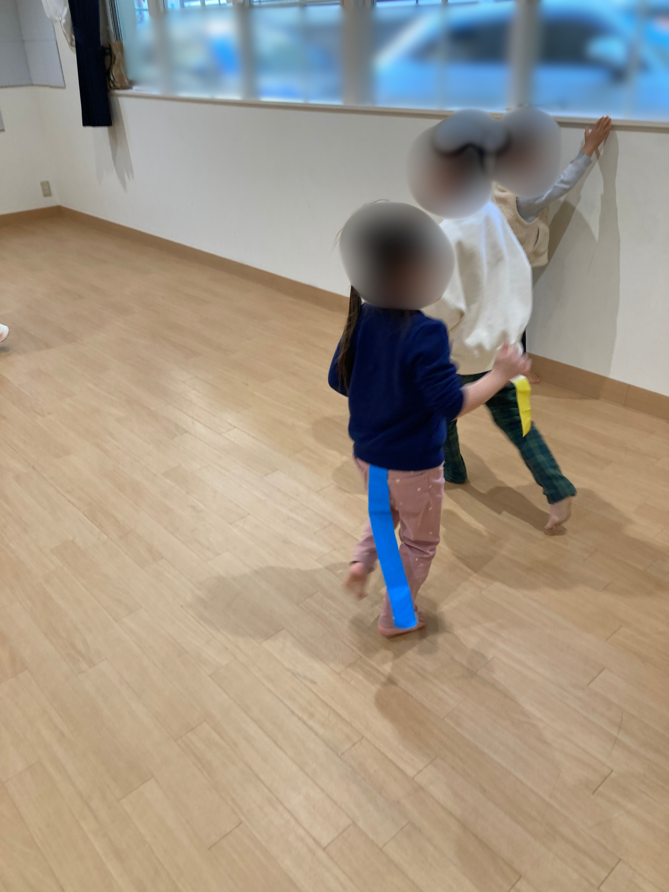 青・黄色・ピンクなど好きな色のしっぽを選んで、付けたら取られないようにたくさん走ります😊