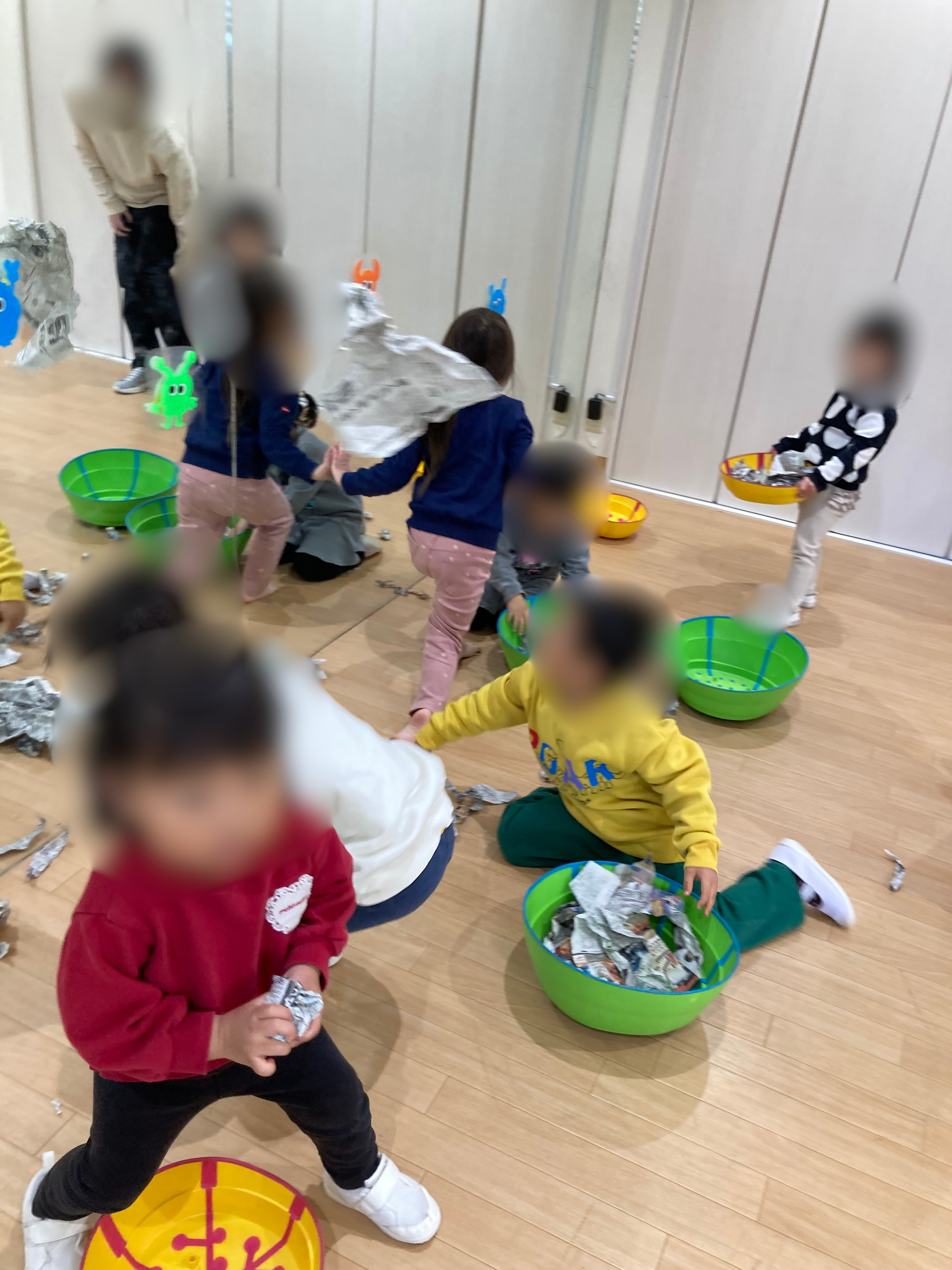 みんな先生のお話を聞いて、カゴに新聞紙を入れ、ボールを作って投げることができました👏