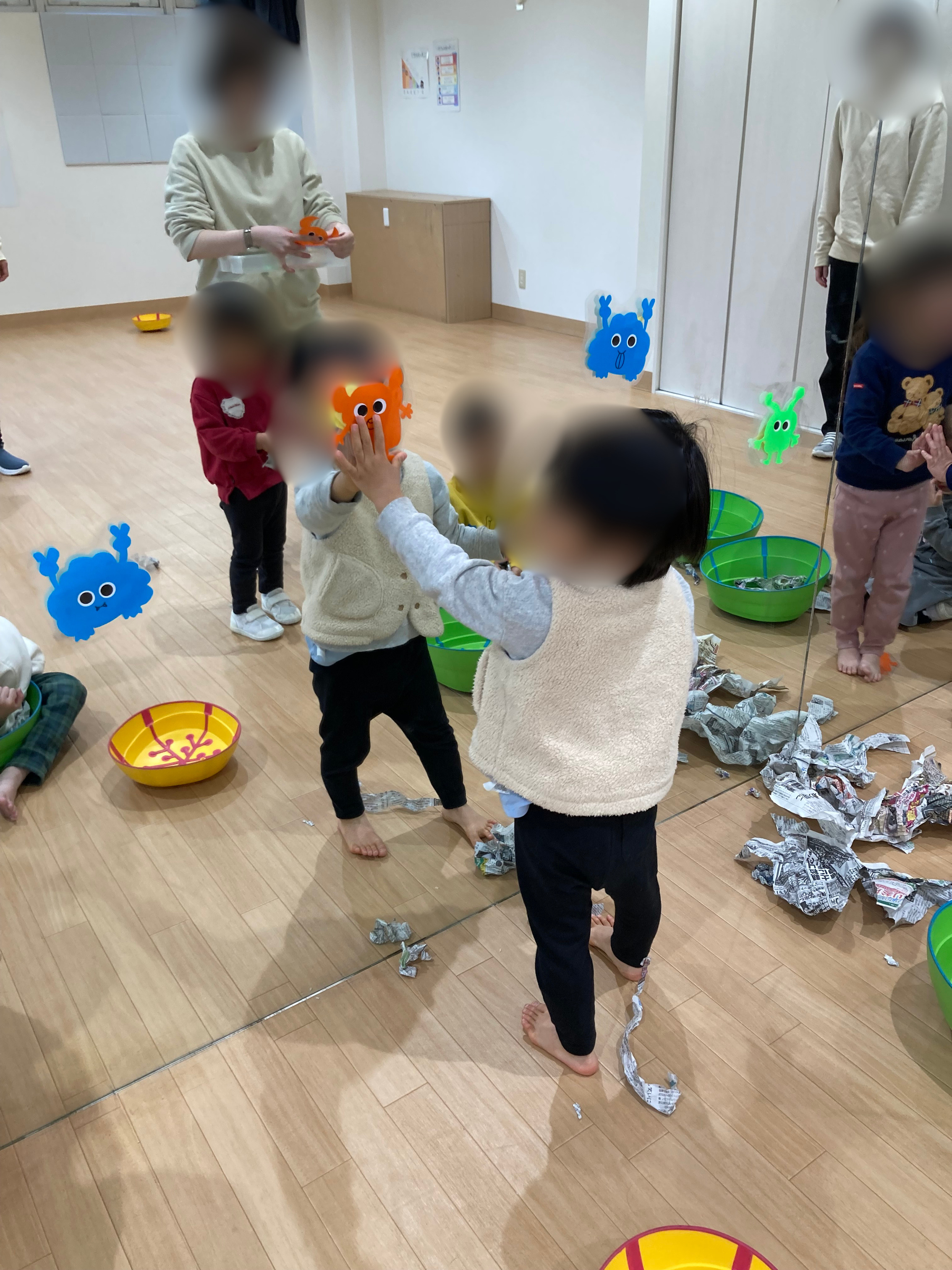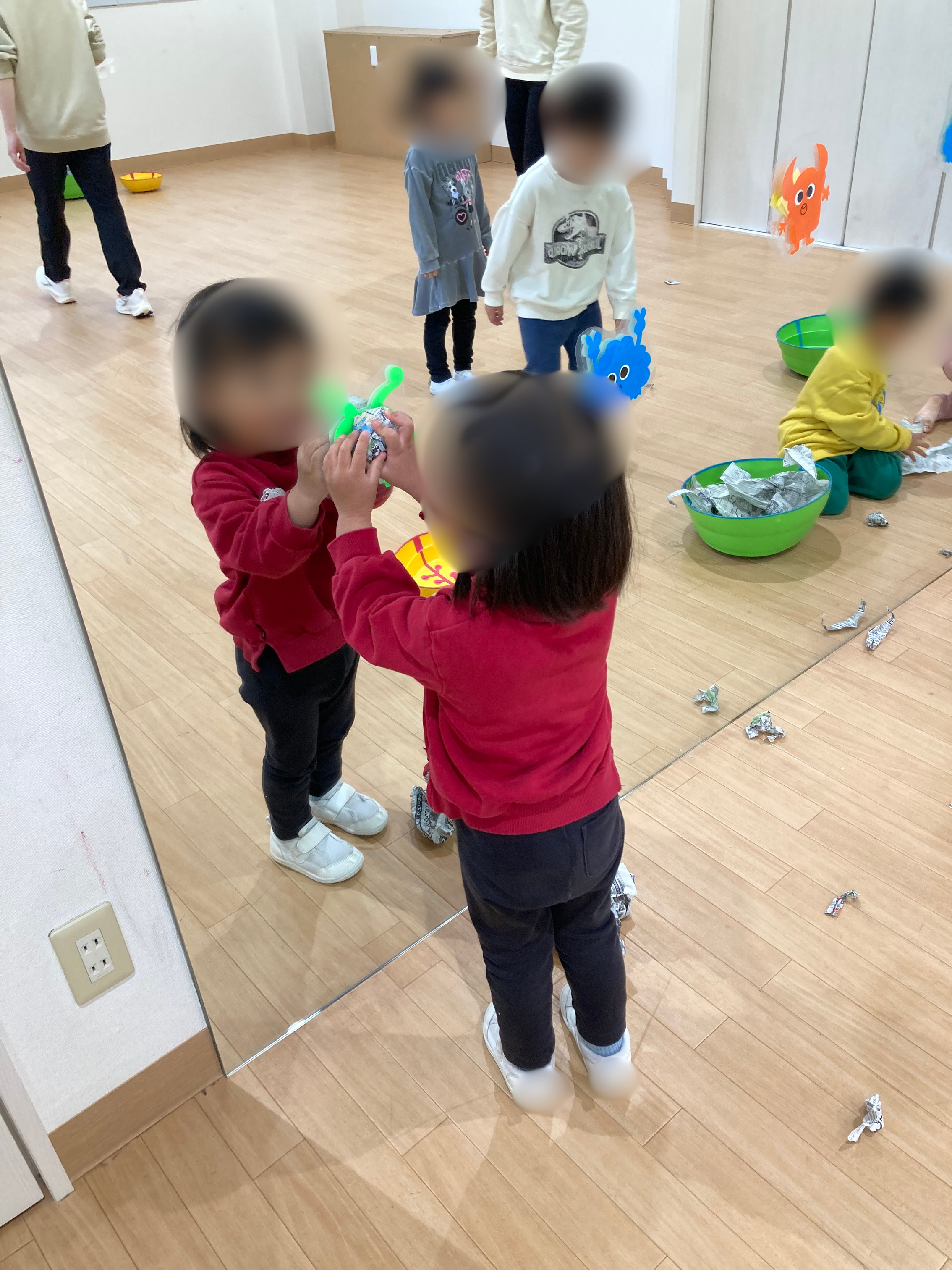 その後は「新聞紙遊び」。鏡に入るモンスターたちに新聞紙ボールを作って投げます!